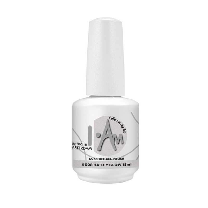 3.Rol het flesje I.Am Collection By BO. Gel Polish ondersteboven tussen de handpalmen om ervoor te zorgen dat het pigment goed gemengd is. Verzegel de vrije rand met I.Am Collection By Bo Gel Polish om duurzaamheid te verzekeren en krimpen van de kleur te voorkomen. Houd het penseel horizontaal op de nagel en ga verder naar het midden van de nagel. Beweeg het penseel vanuit het midden van de nagel omhoog naar de proximale nagelplooi en strijk vervolgens omlaag naar de vrije rand. Zorg ervoor dat de gelpolish niet op de huid komt. Als de gelpolish de huid heeft geraakt, verwijder dit dan voor het uitharden van de nagel met behulp van I.Am UV Cleanser en een Cuticle Pusher. Hard alle vier de nagels gedurende 120 sec. UV / 30-60 sec. LED uit. Herhaal het proces op de andere hand en duimen.